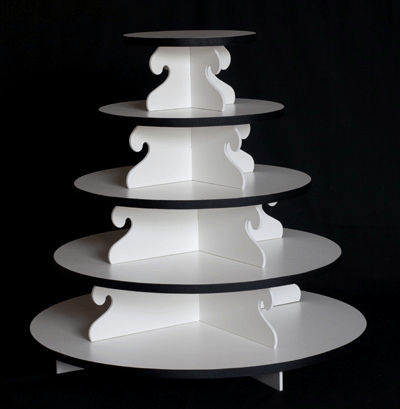 Cupcake tower stands are available for a $10.00 rental fee, and must be returned within a day or two of the event. The tower is pictured below, and the ribbon around each level can be adjusted to coordinate with the occasion colors.