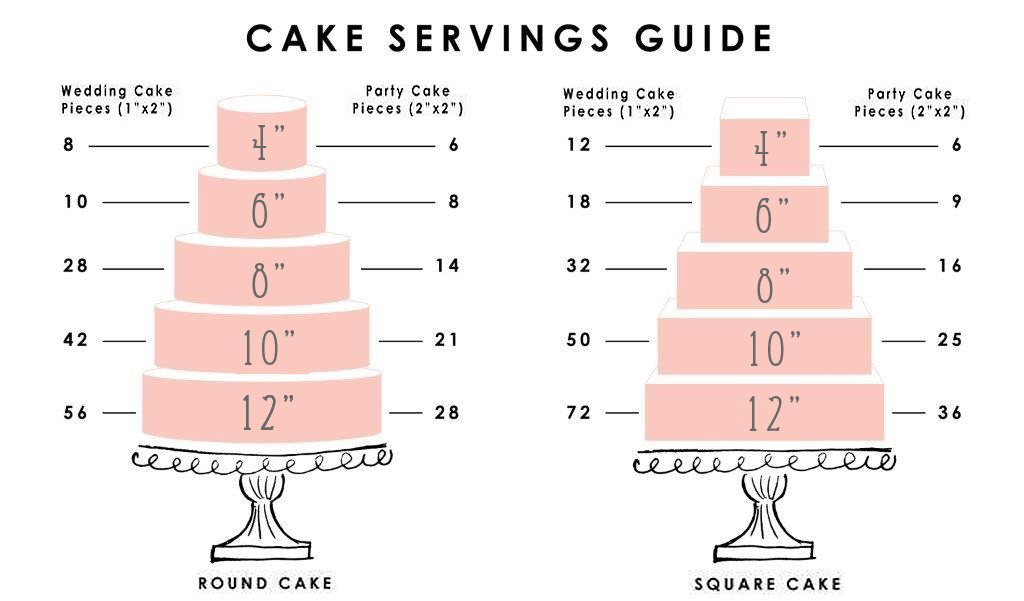 All of my cakes are 4"-5" tall, and consist of 3 layers of cake and 2 layers of filling/buttercream. Cakes are priced per serving, which is $3.00/serving. Refer to the charts below, which will give you an idea of how many servings each cake size will yield. This will also help you in determining the right size cake for your occasion. For each cake size, the lower “number of servings” is usually the amount needed for a party. The higher “number of servings” is typically reserved for weddings, since the slice is much smaller. For pricing purposes, the LOWER number is used.