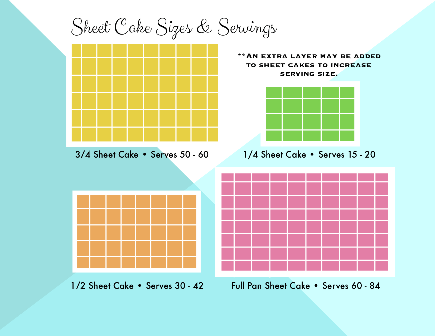 Sheet cakes are also available, and have a standard price for basic flavors (chocolate or vanilla) and design. Additional decorations and flavors will be extra. The chart below will give you an idea of how many servings each sheet cake will yield. The prices are: